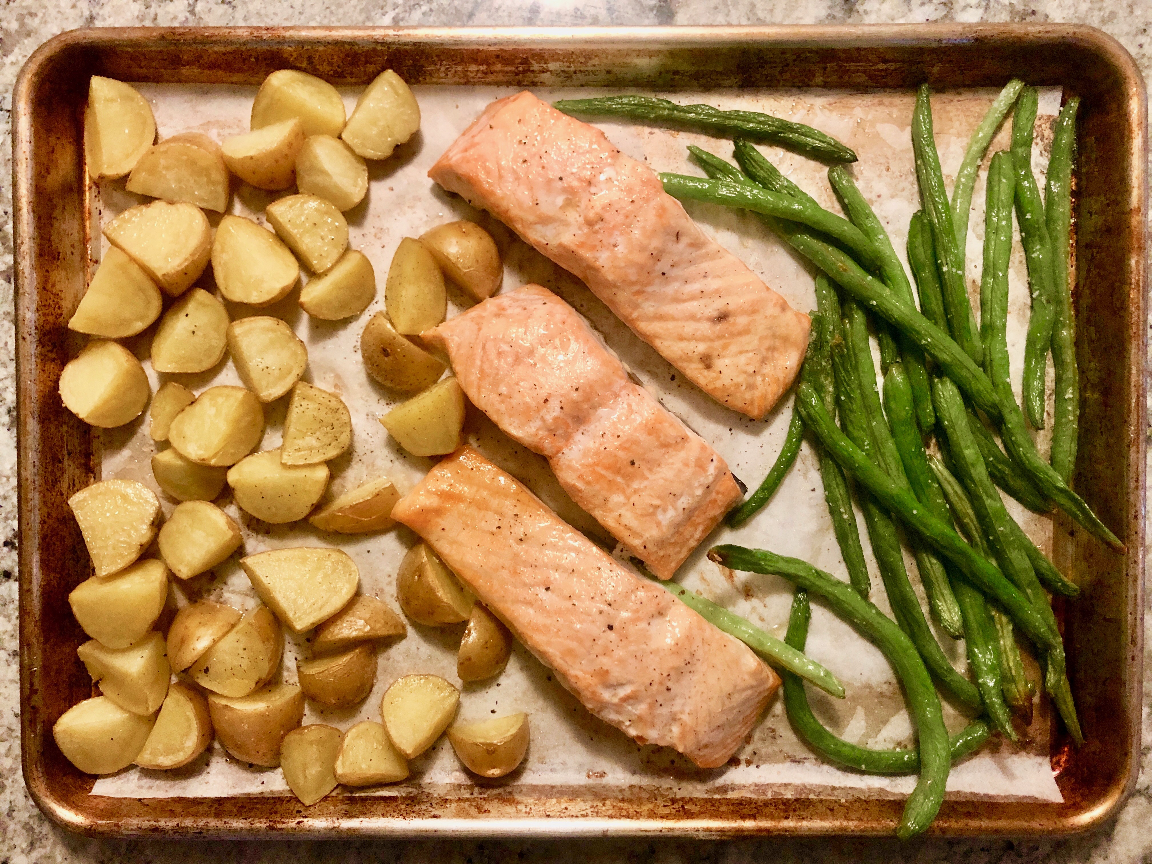 We make a one-sheet-pan dinner like this at least once a week. My formula is one protein + one starchy root vegetable + one other vegetable. The key is to choose ingredients and make sure they are all sized to cook in about the same time (15-25 minutes at 400 degrees is typical). Other favorite combinations are: cod fillets (thicker is better) + fingerling potatoes (quartered) + whole cherry tomatoes; and chicken thighs (boneless, skinless) + cubed butternut squash + halved brussels sprouts.
