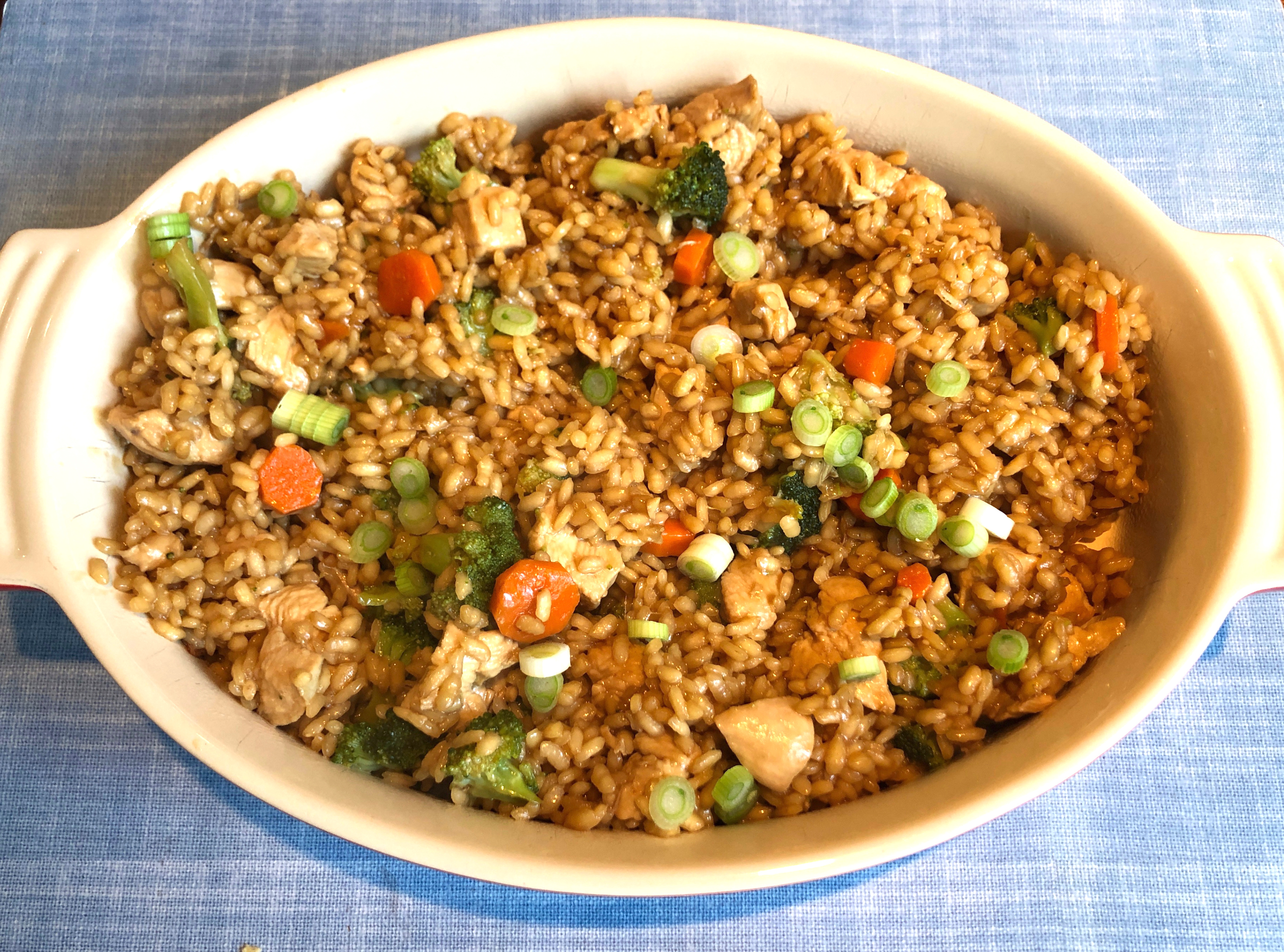 Dicing protein and vegetable pieces into uniformly small pieces goes a long way in making them more palatable to kids. There are many variations of this recipe across the internet, but I've found that many overdo it on the teriyaki sauce (making it too salty) or water (making it too mushy). This balance works for us.