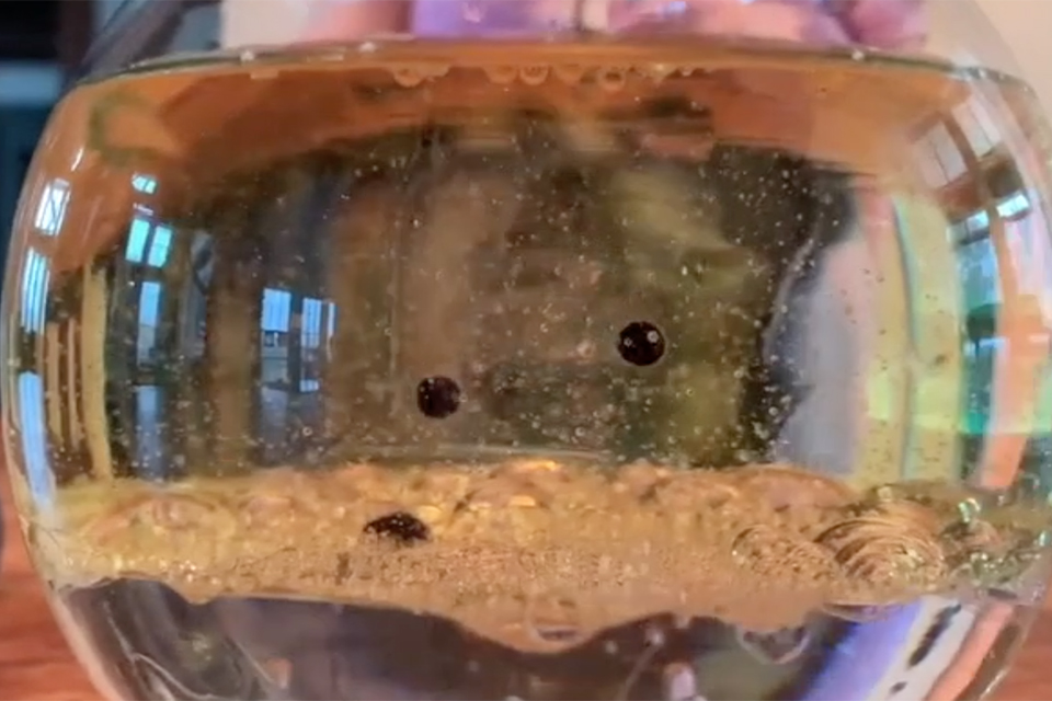 Drop your Alka-seltzer tablet in and let the games begin! The Alka-seltzer water reaction produces carbon dioxide gas bubbles which stick to the water droplets. The water/gas combo is less dense than the vegetable oil, so they rise to the top. The gas bubbles then break and are released into the air and the water sinks back down to the bottom to start over again!
