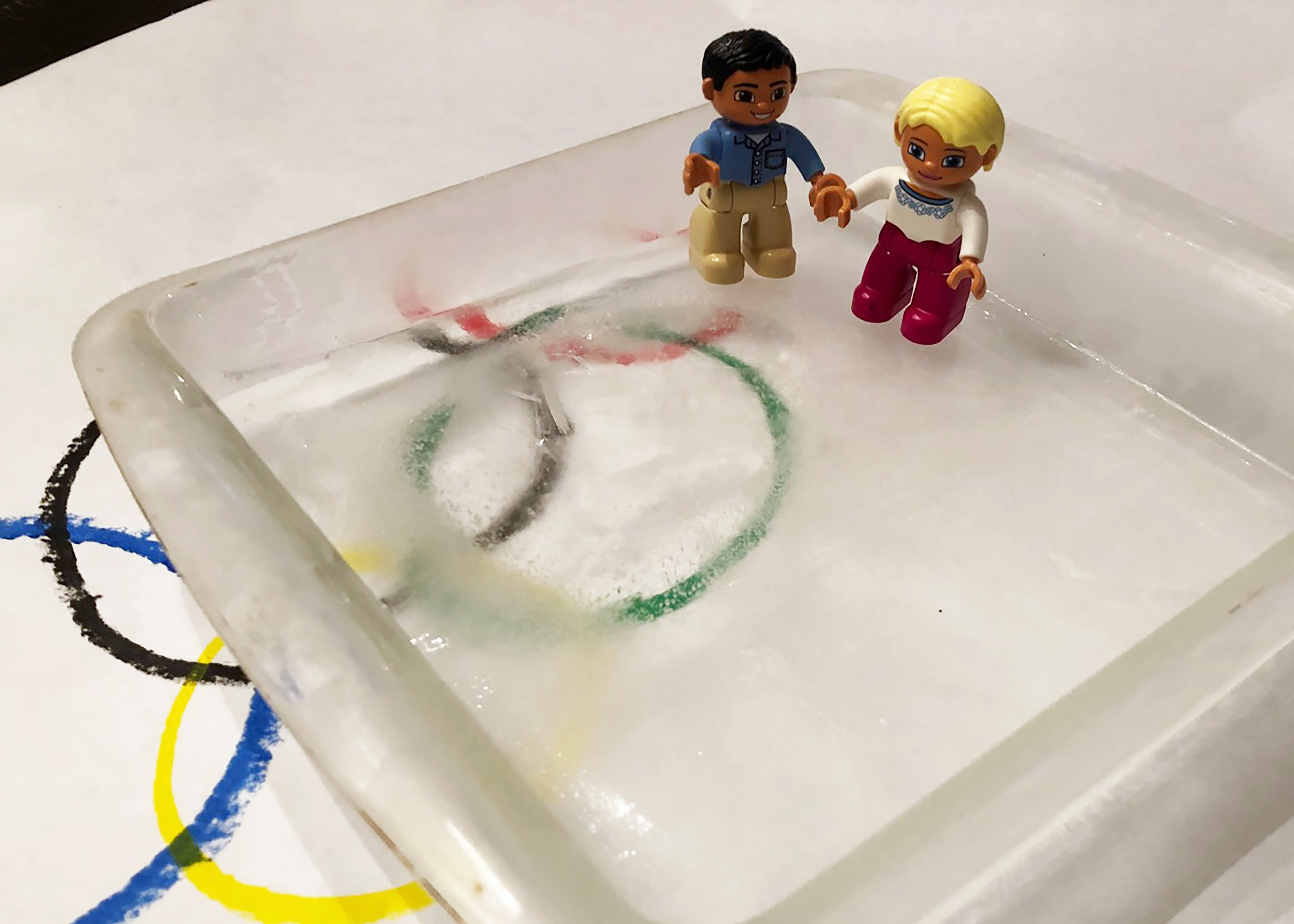 6. A couple of days before the party, help your kids make miniature Olympic competition venues. We made a ski slope, a skeleton run, and an ice rink. For tutorials, take a look at the mini ski slope and mini ice rink from Toddler Approved. When it’s party time, pull out the little plastic people your kids have stashed all over the house and use them as tiny athletes who are competing. Glide them on the mini ice rink or tape on some popsicle-stick skis and race them down the mini ski slope (my son also put his Playmobil people in milk bottle caps for a tubing race).
