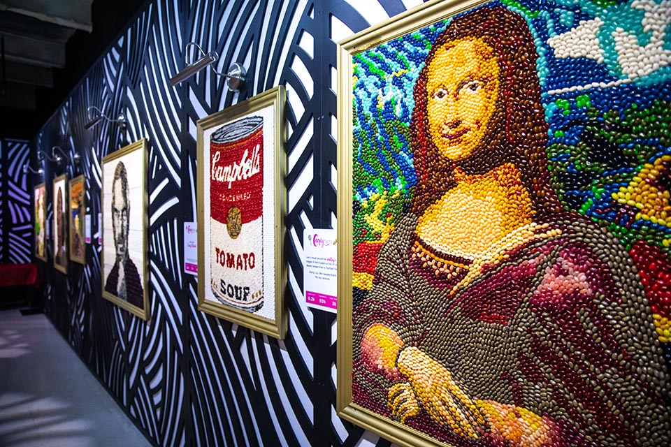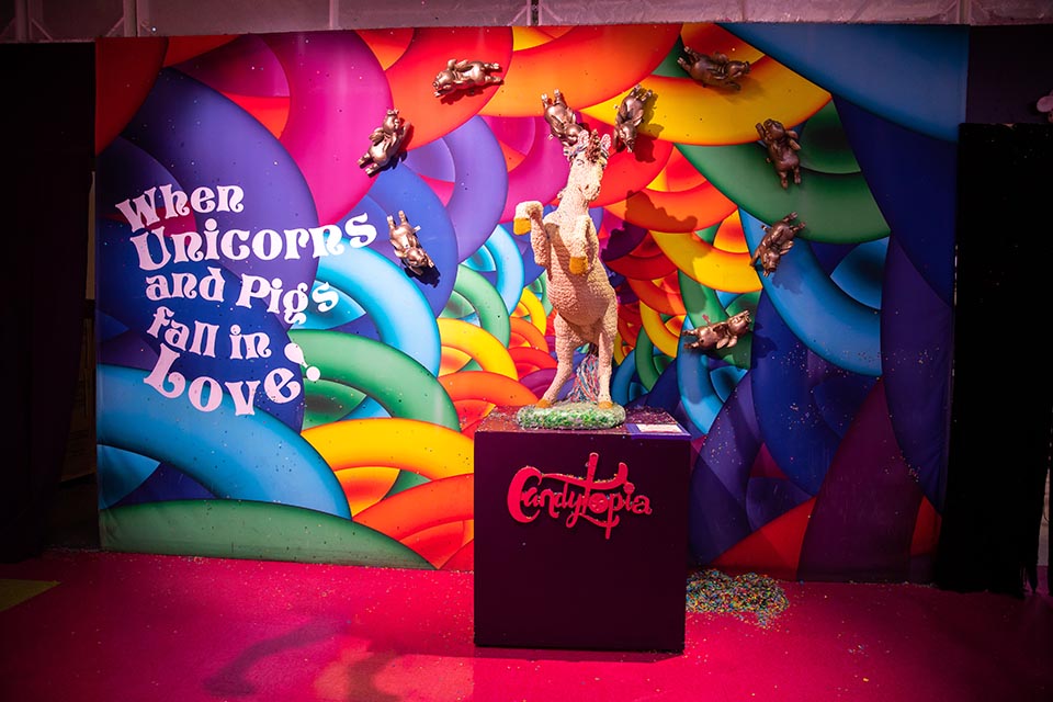 Ready to dive in? Like a kid in a candy store, visitors to Candytopia are invited to journey from room to room, checking out whimsical artwork displays done with colorful bits of candy. Attendants dressed like workers in a Wonka factory help guide visitors along the way and add to the fantastical setting.