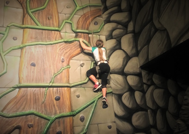 Featuring the theme of ancient ruins, the climbing wall poses three levels of difficulty and is challenging without being intimidating.