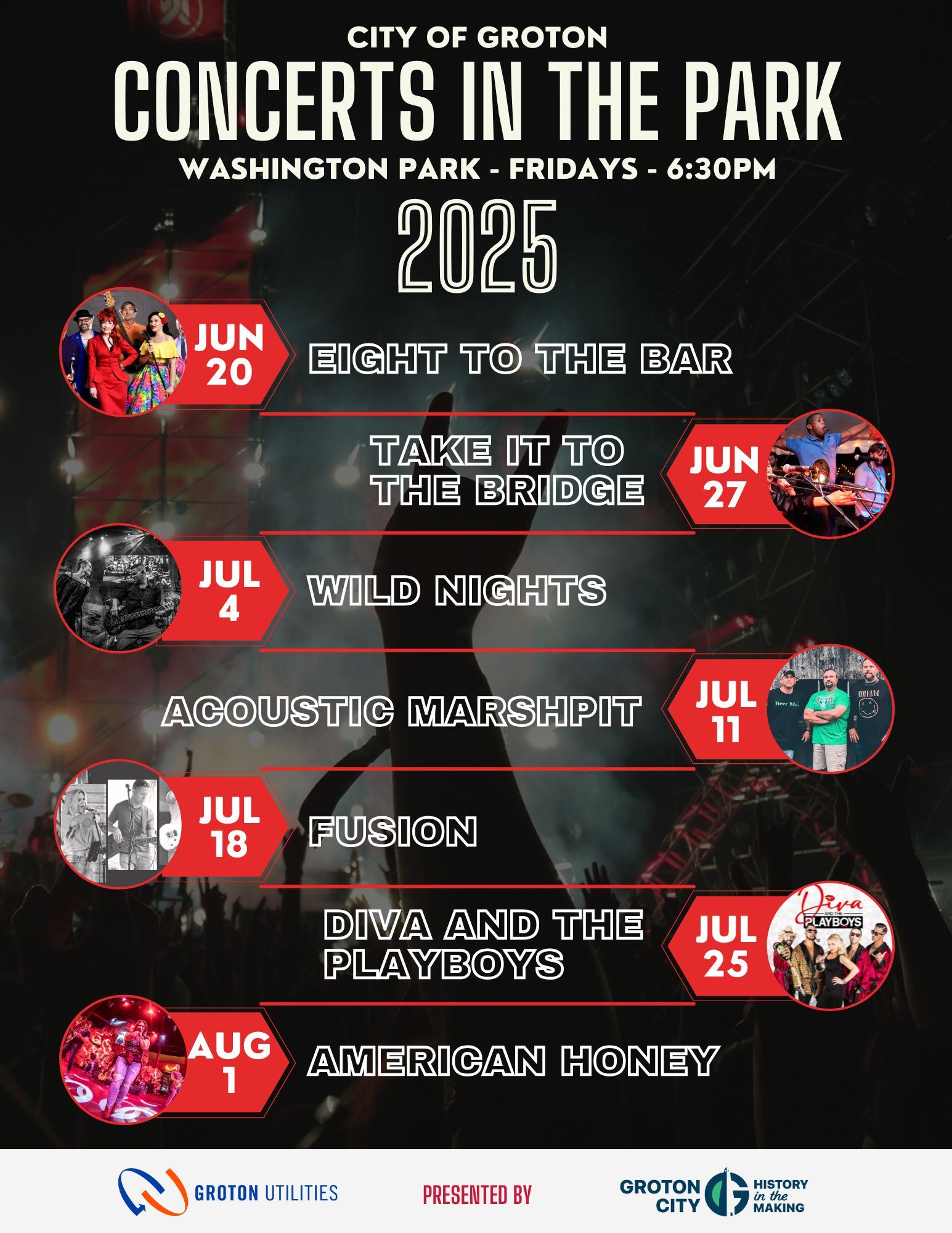 The Friday Night summer concert series is held at Washington Park, Meridian Street in Groton. All concerts start at 6:30 pm and are co-sponsored and co-produced by Groton Utilities and the City of Groton Parks and Recreation Department.