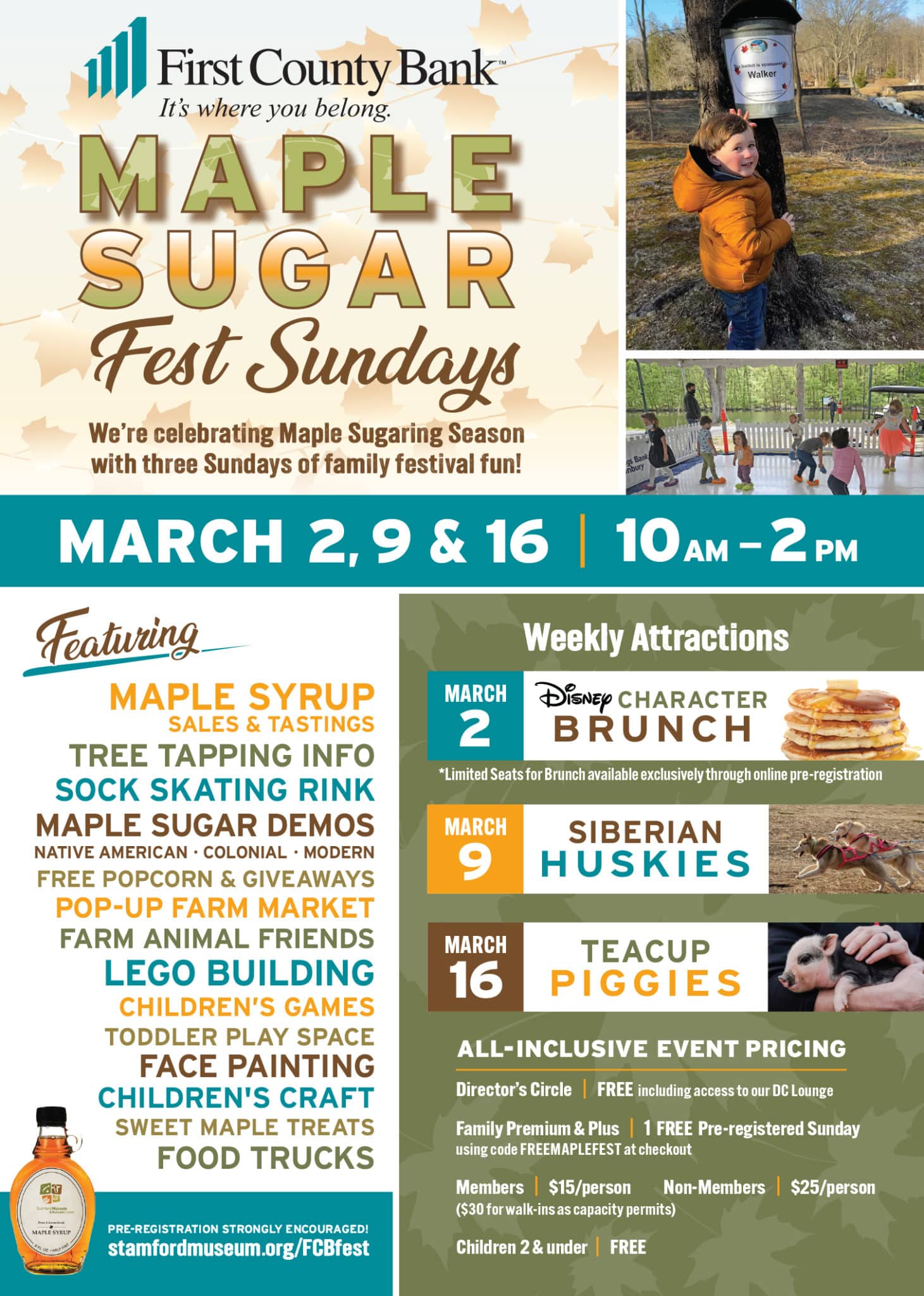 Join SNC for our annual First County Bank Maple Sugar Fest Sundays. There will be tons of festival fun as we make our very own line of maple syrup from the 200+ mature maple trees found right here on our 118-acre campus. We’re one of only two official maple sugar producers in Fairfield County.