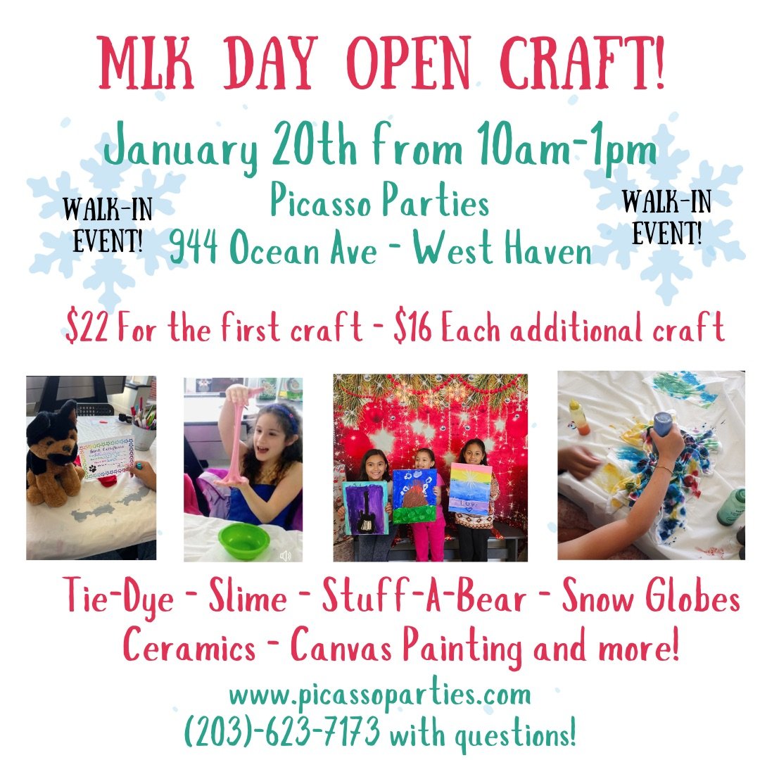 Picasso Parties is having a WALK-IN Event with no sign-up needed! Kids can do as many crafts at they want ($22 fior the first craft) such as Tie-dye, Slime, Stuff-A-Bear, Snow Globes, Ceramics, Canvas Painting and more!