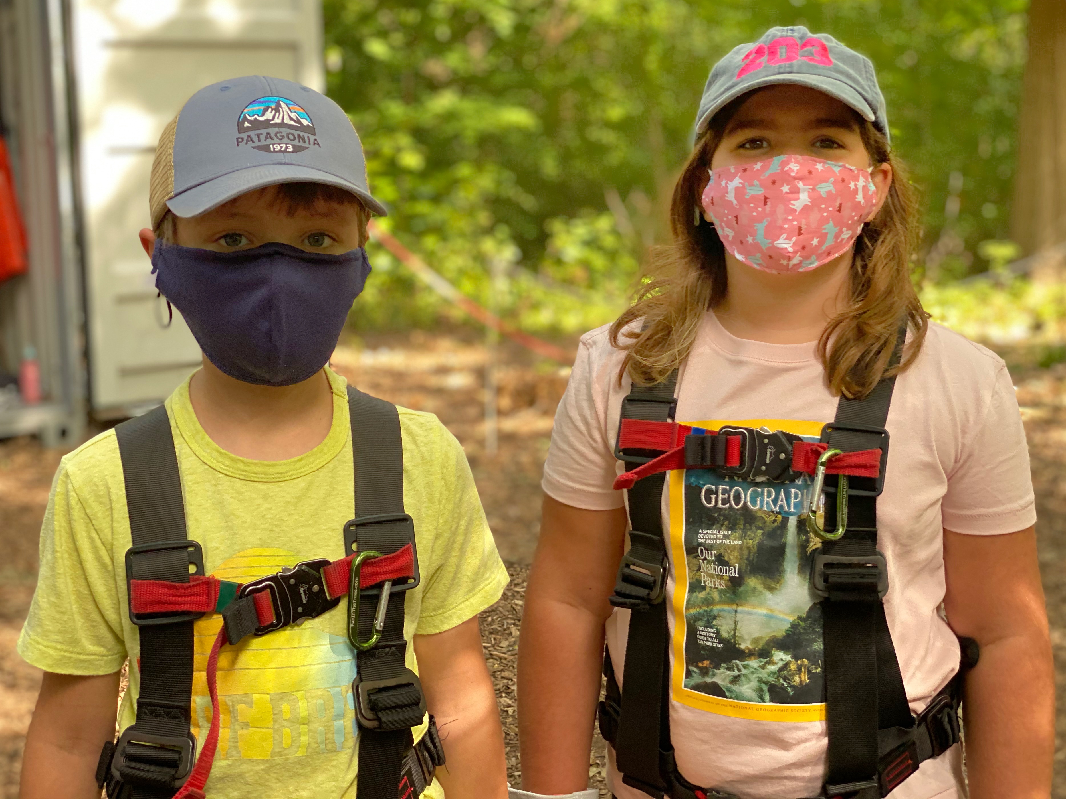 Adventure Park at the Discovery Center in Bridgeport makes sure kids are outfitted securely in 2020—with safety-checked harnesses and masks! Photo courtesy of Ally Noel