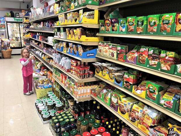 Not speaking Polish did not hinder our ability to peruse store shelves or purchase items. The friendly employee at Pulaski Delicatessen tried teaching us how to pronounce “poledwica lososiowa” and though we failed greatly, we definitely enjoyed the smoked pork loin (when we returned to our car my children made themselves impromptu sandwiches with the Lithuanian bread we purchased). Additionally, we filled our bag with imported sweets and seasoning for Polish-style cabbage soup.