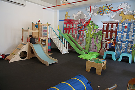 Dave and Mish took over PLAY in September 2013 and the first thing they did was give the place a thorough cleaning with eco-friendly products. They also solicited feedback from past and current customers so they can continue giving families what they want. The centerpiece is still the drop-in indoor playground, which features play sets with slides and stairs, small tables and chairs, riders, and a wide range of engaging toys and pretend stations. There's also a separate area for babies and toddlers where they can crawl around without worrying about getting tramped by the "big" kids. PLAY's signature wall mural, which depicts a colorful Brooklyn street with whimsical elements like giant animals, is still there, too.