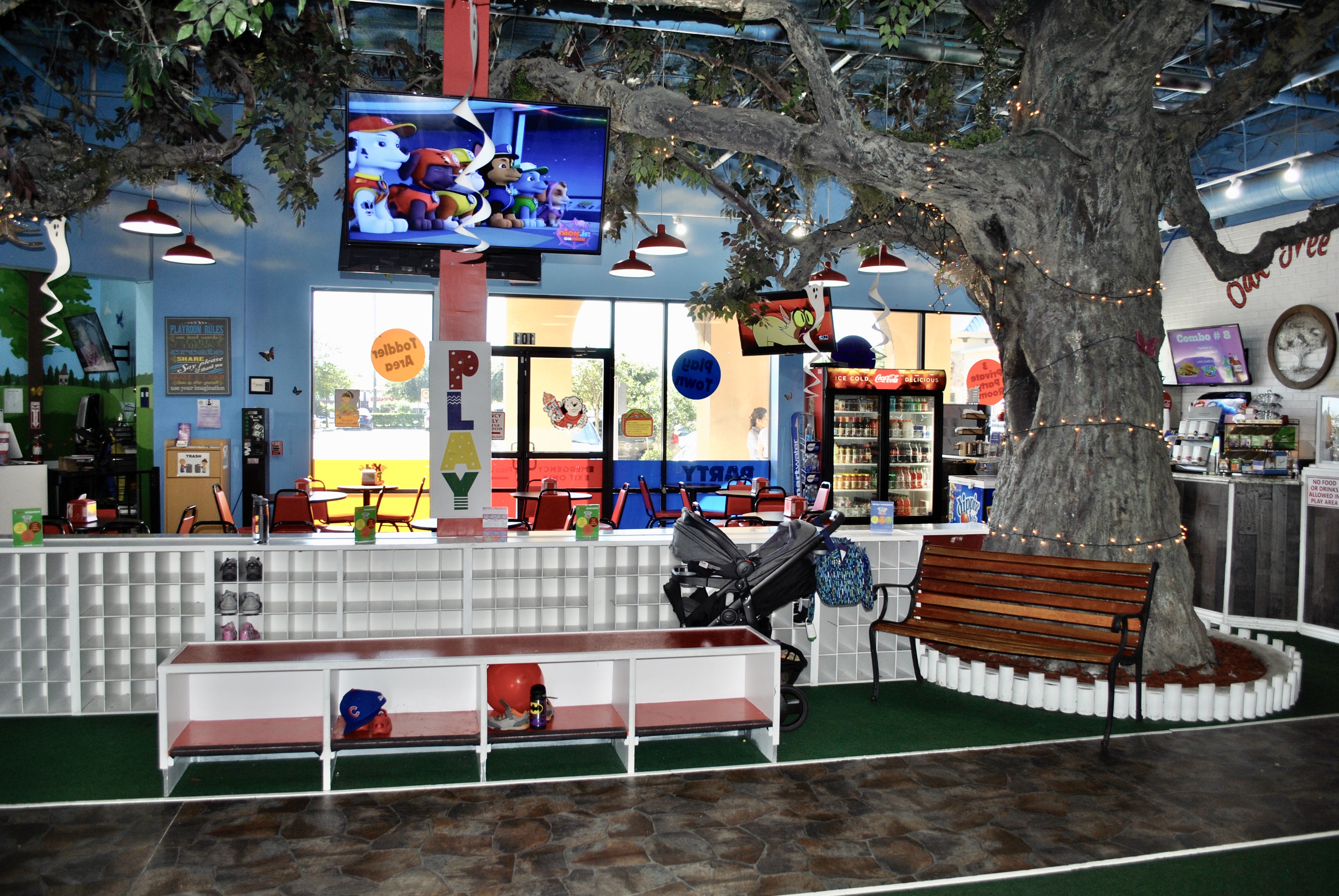 A gorgeous indoor tree creates an enchanting scene between the play area and the cafe area, aptly named the Oak Tree Cafe.
