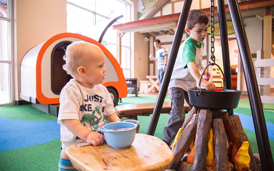 Learning how to set up camp at the indoor campsite exhibit/ Photo courtesy McKenna Children's Museum