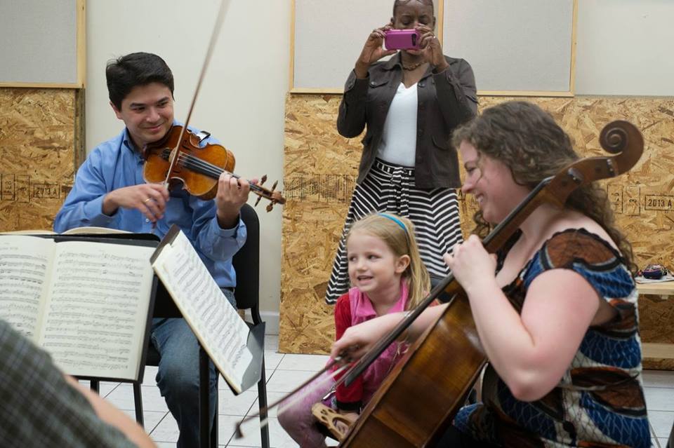 Photo by A Far Cry, taken during a 'Happy Hour' open rehearsal in Jamaica Plain.