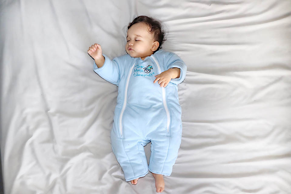 Baby Merlin's Magic Sleepsuit helps babies transition out of the swaddle while keeping the startle reflex in check.