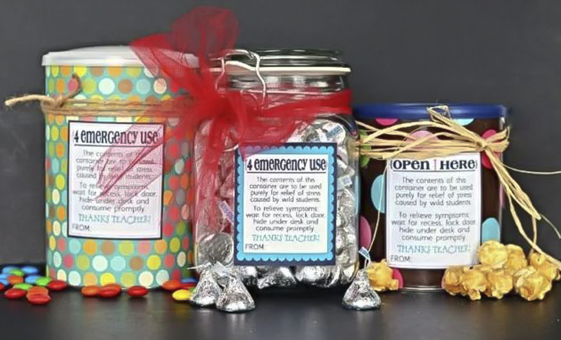 Get creative crafting an emergency stash of goodies for teachers to keep in their desks. We love the personal touch of this apple-inspired candy dish, which hides the contents brilliantly, and this sweet Hershey's Kiss-filled jar. For teachers that prefer salty over sweet, this nacho-themed gift basket is sure to be a hit.