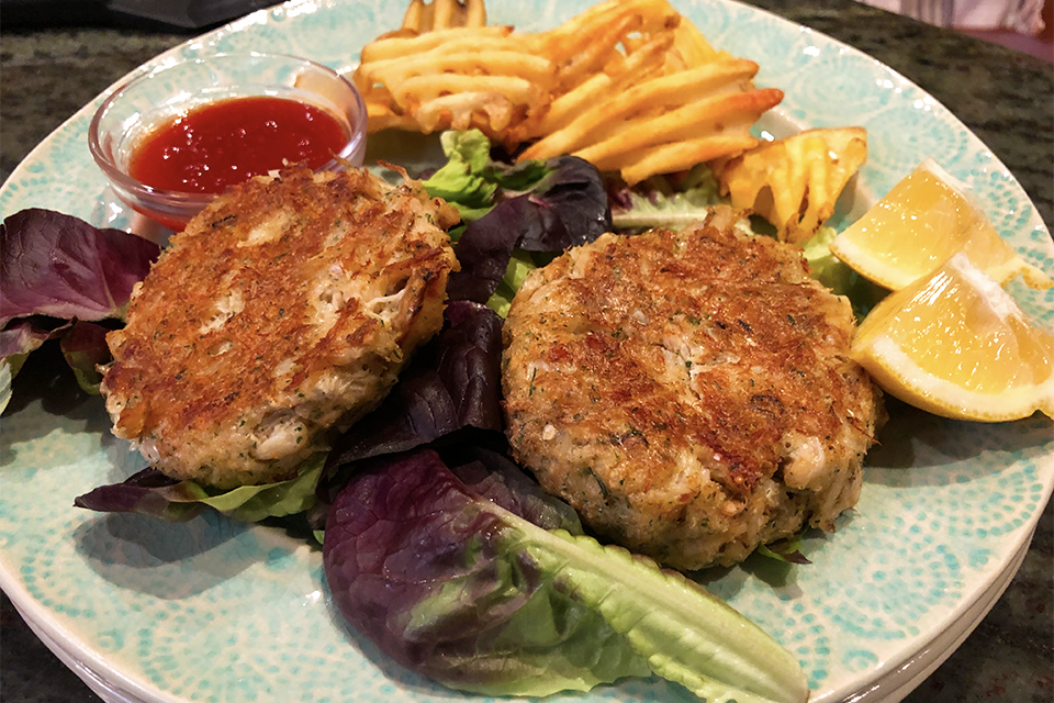 Spread the fries out on the tray and bake for 15 minutes. While baking, whip the egg and mayonnaise together with the spices. Fold in the crab (pick it over for shells) and crushed crackers. When the french fries are ready, pull the sheet pan out of the oven and move the fries to half of the tray. Shape the crab into 6 big or 8 medium-sized cakes. Put the tray back in the oven and bake for 13-15 minutes, depending on the size of the crab cakes. Serve the crab cakes on a bed of lettuce with either a squeeze of lemon or some cocktail sauce. (And ketchup for the fries, of course!)
