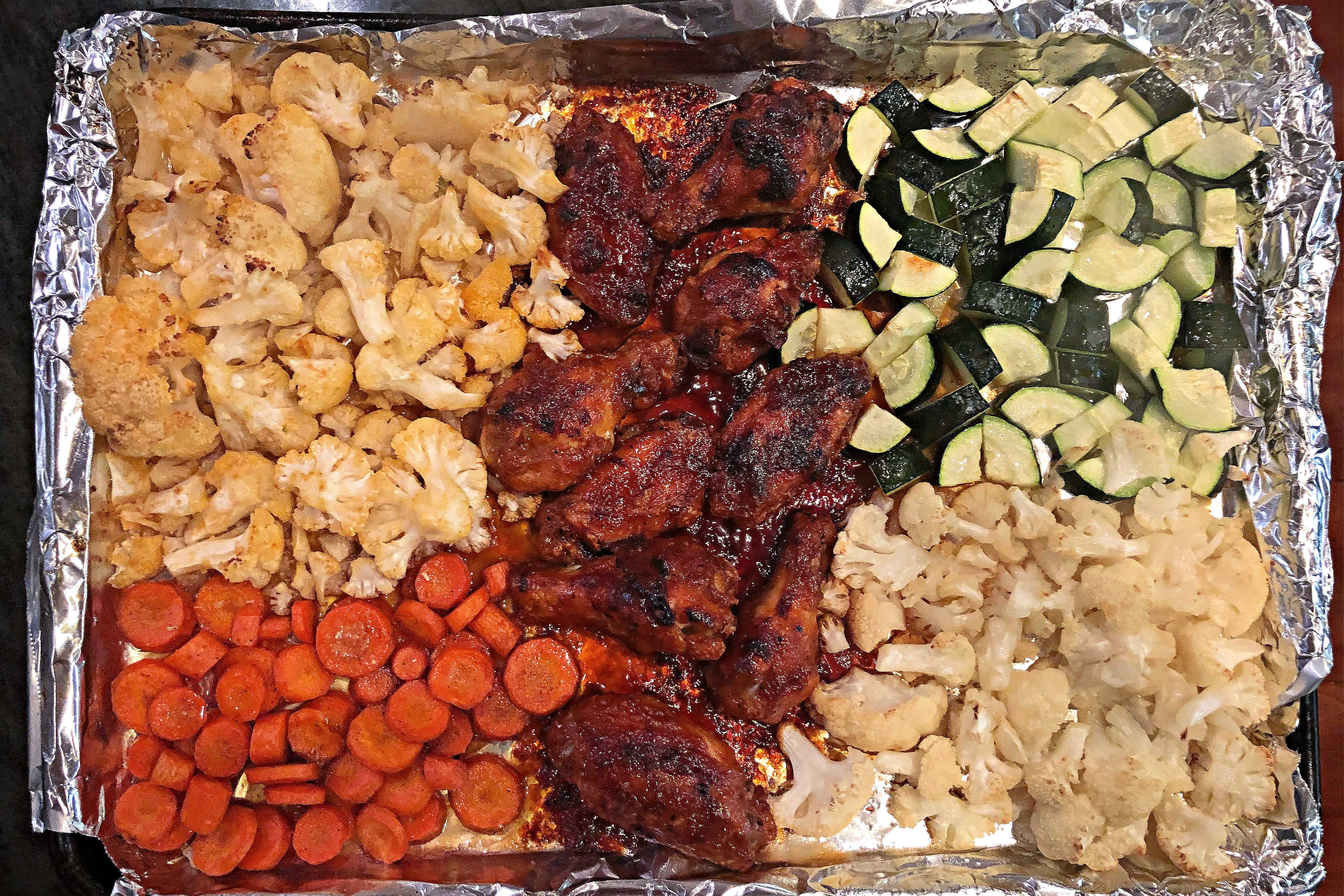 Mix the flour, salt, garlic, and paprika in a bag and shake your wings in it to coat. Spread the wings out on the pan and bake them for 25 minutes. After 25 minutes, take the wings out of the oven, toss them in a bowl with BBQ sauce and honey, and put them back in a line down the middle of the tray. Put your vegetables, seasoned to taste, in each corner, and return it to the oven for another 25 minutes. Serve with a side of rice.