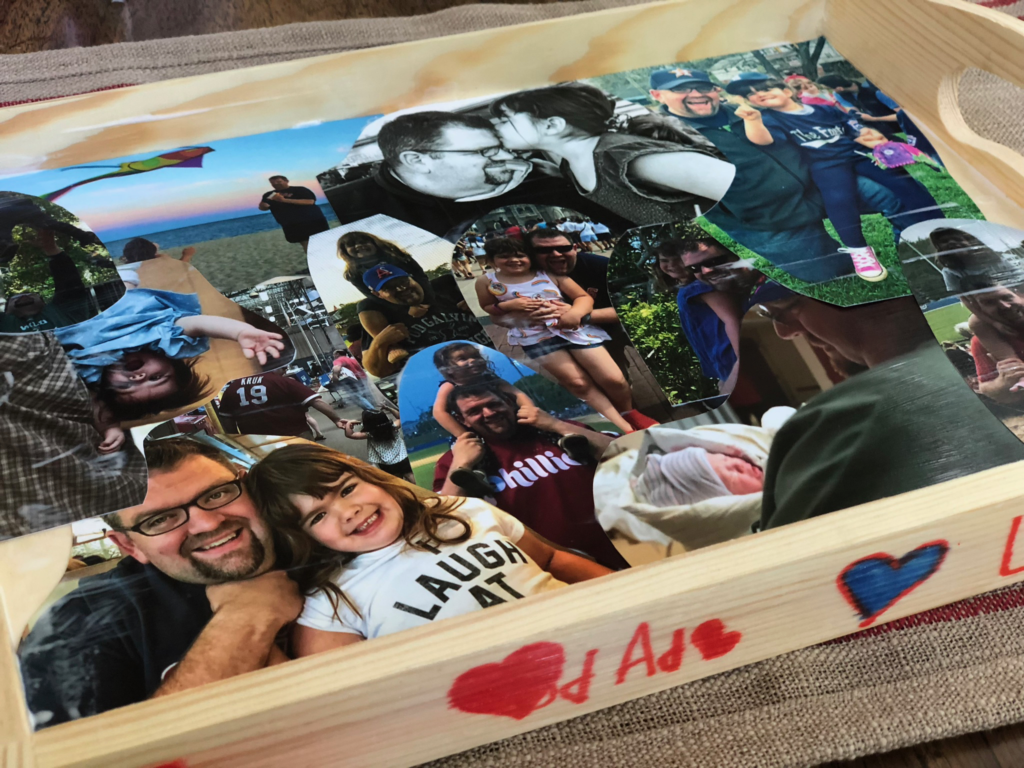A plain wooden tray is the start of this easy Father's Day craft. Dress it up and decorate it especially for dad to give him an extra special spot to place his keys, wallet, and phone. Select a bunch of photos to create a collage on the bottom of the tray. Use Mod Podge to seal the photos for a lifetime of memories
