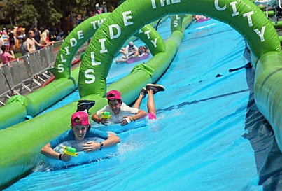 Slide the City features a 270-foot water slide parked downtown in Foley Square, along with a Vita Coco Beach that includes lounge chairs, free coconut water from the sponsor and palm trees.