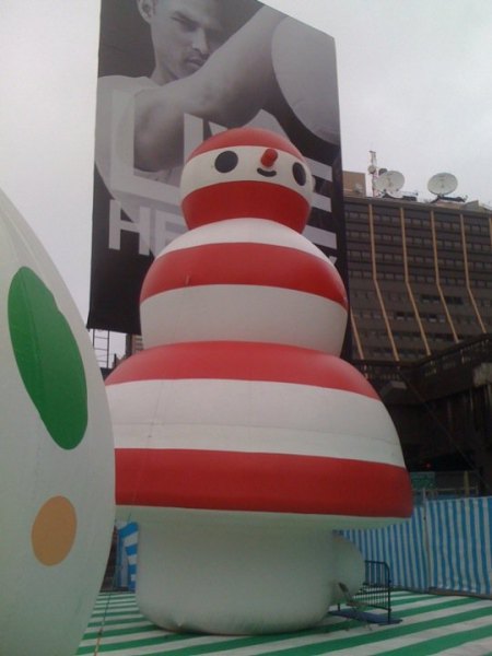 The juxtaposition of the playful, colorful attractions against the industrial urban landscape is quite striking. (I also love the contrast between the happy striped snowman and the pouty model on the billboard behind him.)