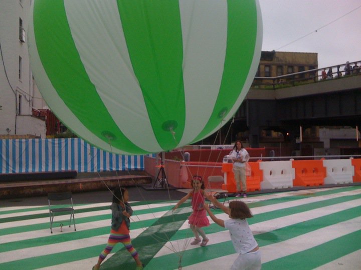 It was rainy and windy the day we visited Rainbow City, which was created by two-person art team FriendsWithYou. The upside: No lines and lots of action from the suspended orbs, which kids are allowed to poke and prod without reprimand. The downside: Some of the inflatables weren't on display, or had limited access. A large, white blob (which, according to a staff member, was meant to recall childbirth as you emerged from a thin hole) wasn't letting people in due to the breeze. Frankly I'm kind of glad we didn't go there.