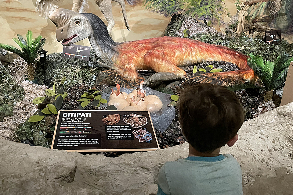 In the main exhibition hall, find snakes, brightly colored sun conure parrots, tree frogs, and some fascinating stick insects. A lot of stuff is neatly packed into this relatively small space, but it doesn't feel crowded. There are T. rex and Centrosaurus skulls, full skeletons of an Allosaurus, Camarasaurus, Maiasaura, and more. There are also smaller skeletal pieces displayed, as well as a set of hadrosaur eggs. Realistic and high-quality animatronic models include the Ankylosaurus and Stegosaurus. Though their heads and tails move, and they make noise, it's not at all frightening. New for 2021 is the Citipati model. The feathered dinosaur is displayed protecting its nest.