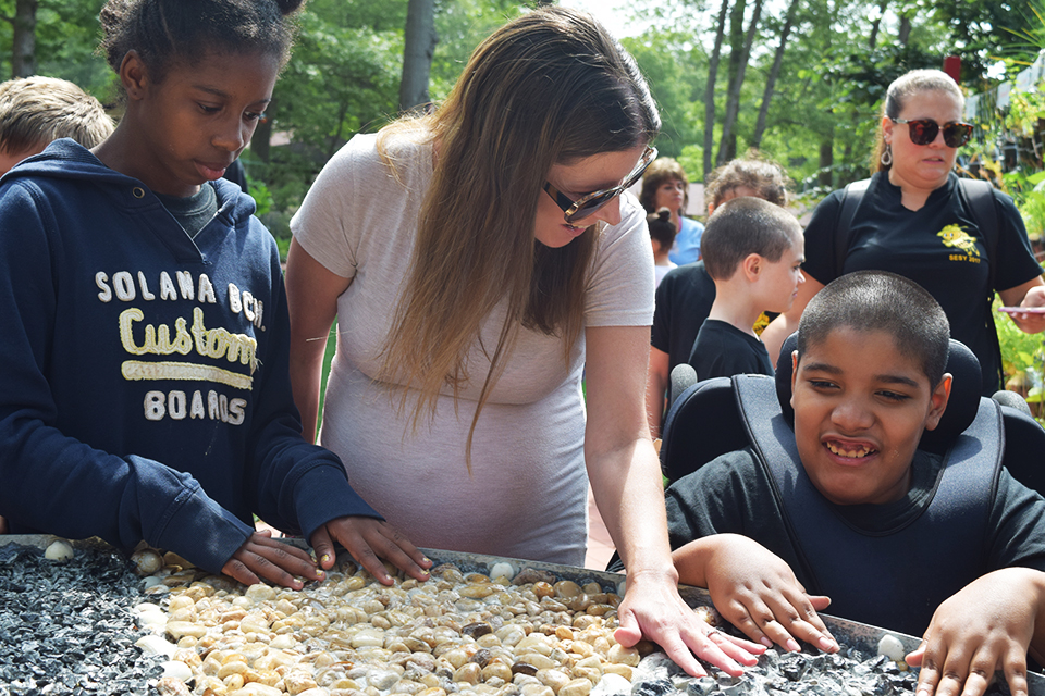 Venture further into the garden and you come across a labyrinth made of river rocks. Slip off your shoes to fully experience reflexology as you walk the path of the labyrinth. Discover the large-scale sensory wheel. The surface of this elevated wheel is covered with rocks and shells of different textures. Spin the wheel to experience bumpy, rough, soft, and smooth sensations. Over on the grassy area is a covered sensory sand table that employs sight and touch to dig through the sand for objects hidden inside.