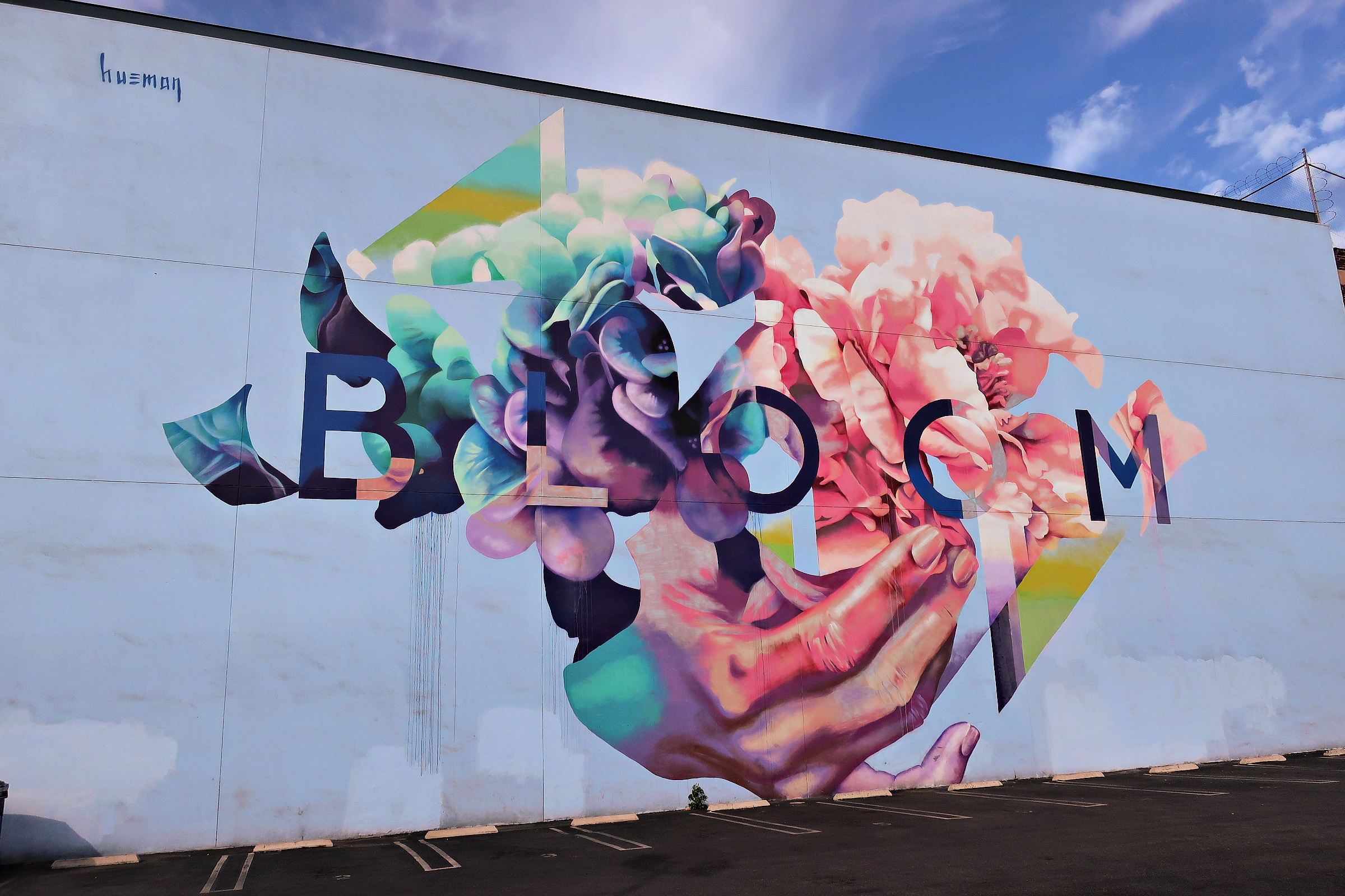 Covering an entire wall in the DTLA neigborhood known as Joel Bloom Square is a beautiful mural by artist Hueman called "Bloom" (701 E. 3rd St.). The painting shows a hand clutching a colorful bouquet of flowers. My daughters say it just gives them good vibes.