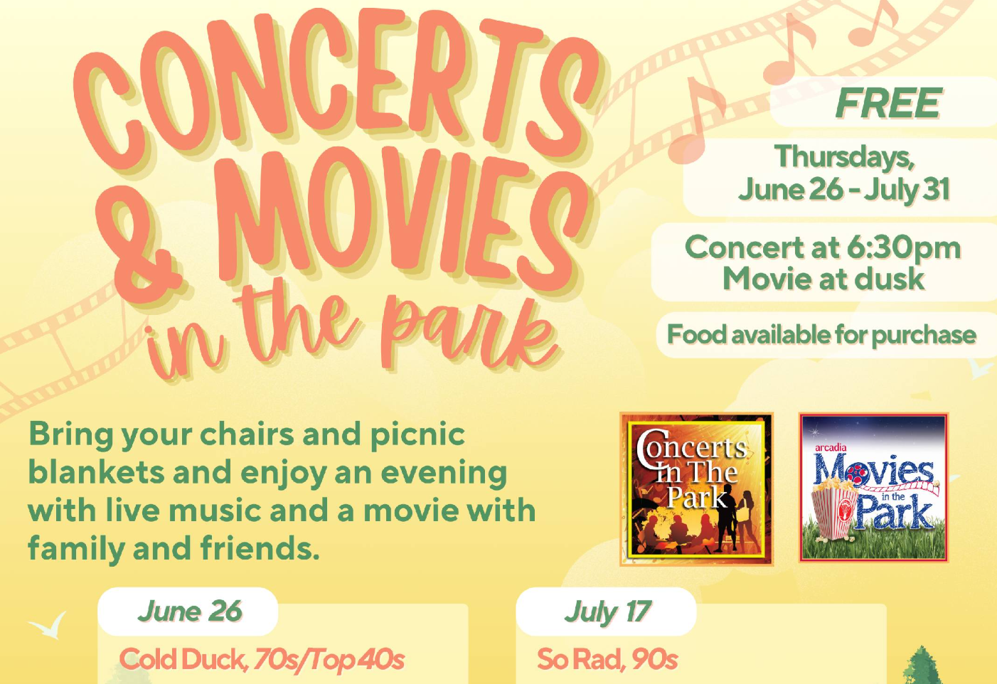 Arcadia's summer movie and concert series are held together. Concerts begin at 6:30pm, followed by the movies at dusk. All of this year's movies are rated PG.