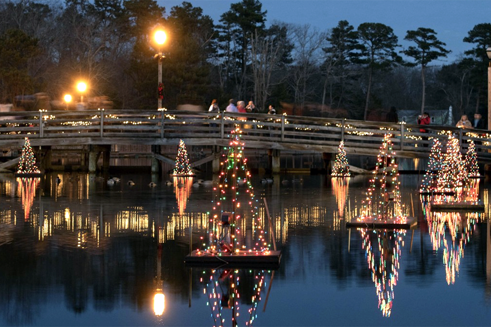 See the trees floating on the lake in a holiday light show at Historic Smithville. Photo courtesy of Historic Smithville
