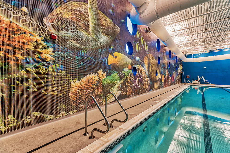 The decor here also keeps kids engaged. A fun sea life mural with porthole windows that look like rising bubbles flanks the pool. Fish tanks and other aquatic touches, including a winding waterway with bridges to cross, also make the space unique.