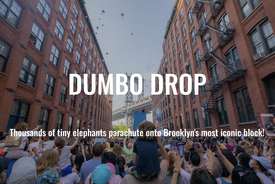 One of Brooklyn’s most iconic experiences, the annual Dumbo Drop—a flying elephant fundraising spectacle—sends thousands of parachuting toy elephants from the rooftops surrounding Washington Street.