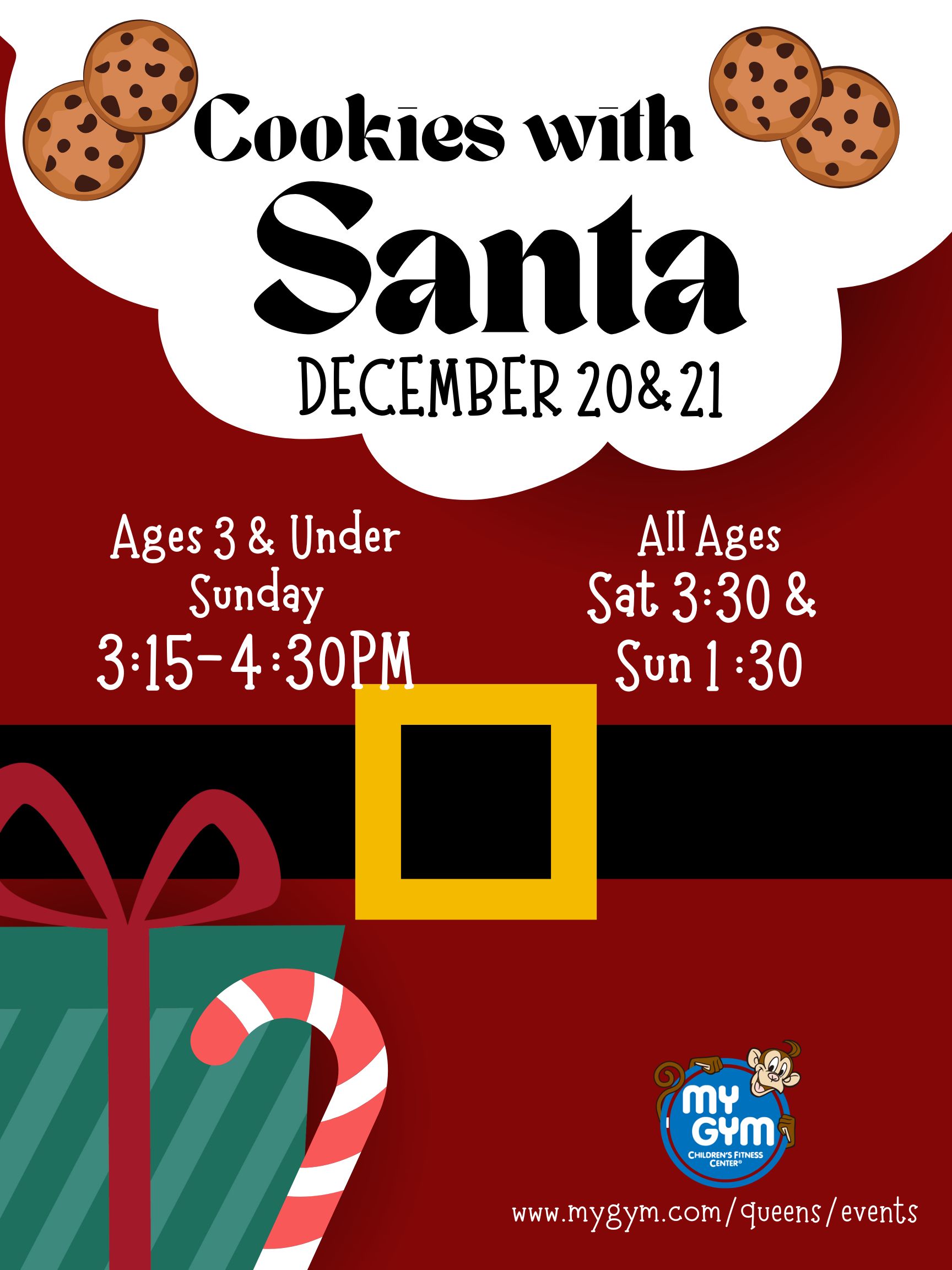 Celebrate the season with Santa at My Gym. The program includes cookies & hot cocoa, photo opportunities with Santa, festive gymnastics activities & holiday-themed games.