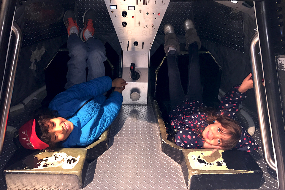 1. The Exploreum: If your kid isn't a full-on history nerd, this section of the Hangar Deck (the main exhibition space) is the most kid-friendly spot on board. This interactive space lets kids climb into a cockpit, pose as the pilot of a small helicopter, explore a submarine's tiny quarters, or fold up like a pretzel to squeeze into a space capsule. There are plenty of kid-friendly buttons to push, steering wheels to twirl, and more.