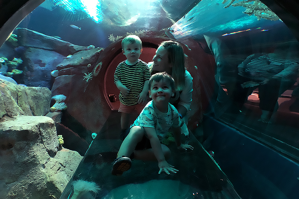 Crawl through a glass tunnel to feel like you're in the depths of the ocean, surrounded by marine life.