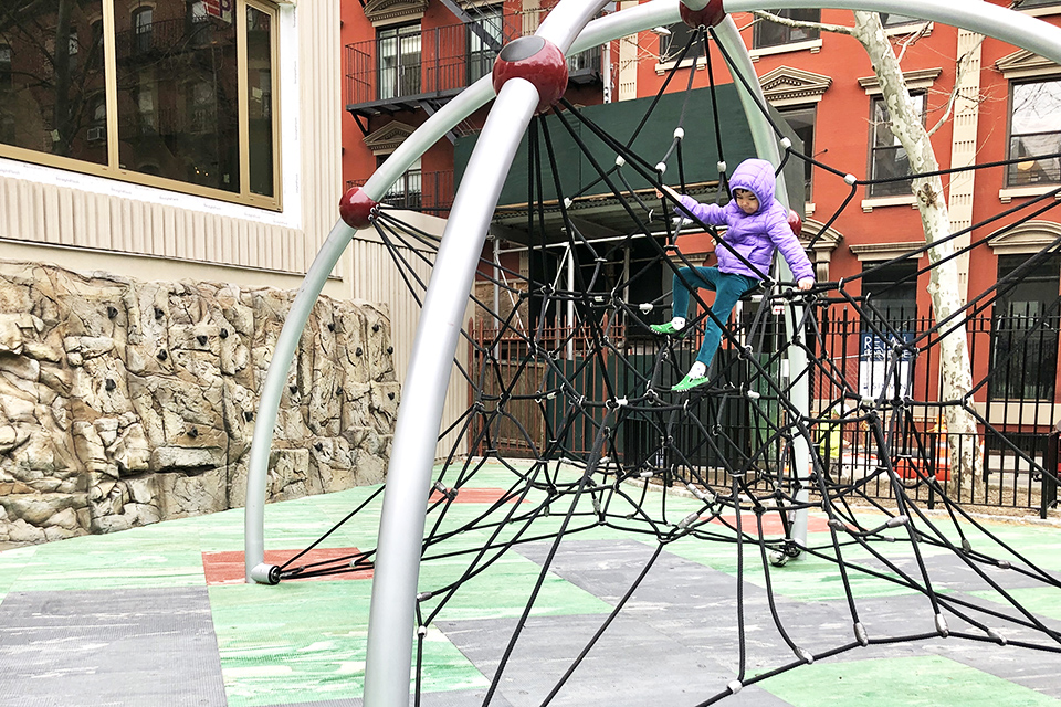 The bright and cheerful colors splashed all over the playground are hard to miss. As we turned onto Spring Street, my daughter shrieked with glee as she caught sight of the multi-hued foam-padded floors and bright green accents peppered throughout the jungle gym. As an adult who appreciates good design, I silently shrieked in agreement.