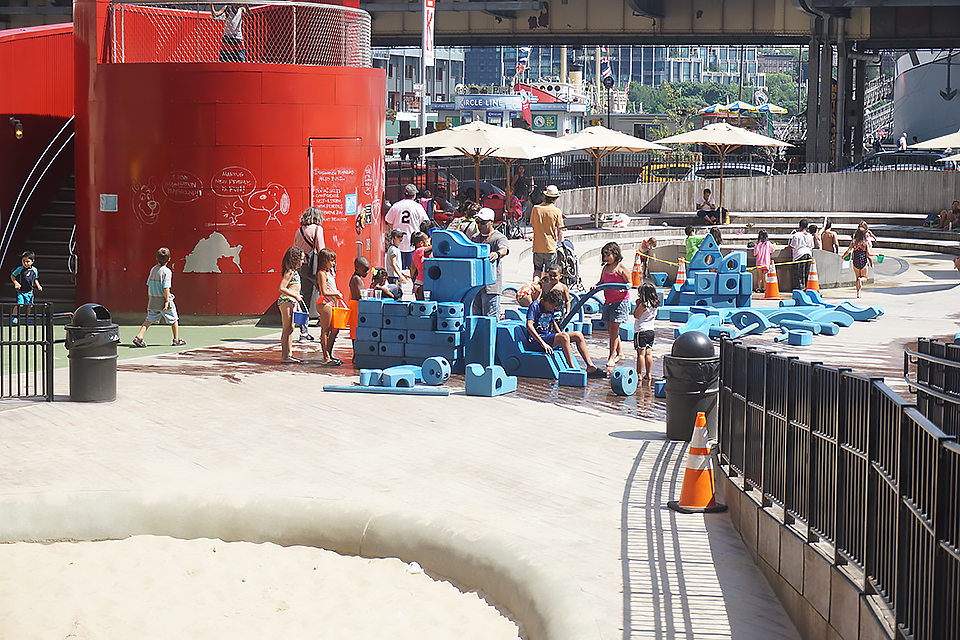 But the heart of the playground is undoubtedly the Imagination Playground Blocks, a collection of giant foam blocks, spheres, semi-circles, pipes, troughs, and balls designed to (what else?) foster imagination. A large deck area in the center of the playground makes a solid foundation for block building; on our most recent visit, kids collaborated to build a seat with a ramp perfect for dousing one another with buckets of water, carted over from the pool area.