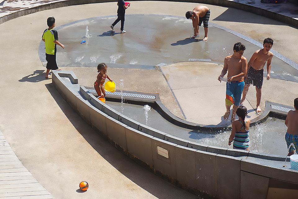 In the water play area on the east side, you'll find a small wading pool with pipes and hoses to encourage building in addition to splashing. A wall on one side churns the water down a cascading waterfall, which kids busily try to dam up before it gets recirculated into the pool below. A few jets spout from the pool and beg to be stepped on or sat on to stem the flow.