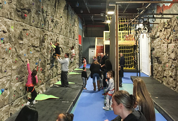Routes are color-coded, making following them similar to a game of Connect the Dots. There is more than 1,500 feet of wall space for bouldering, auto belays with 700 feet of wall space, climbing rings, peg boards, and more, including my older son’s favorite, 150 feet of inverted climbing. Yes, that means you climb upside down.