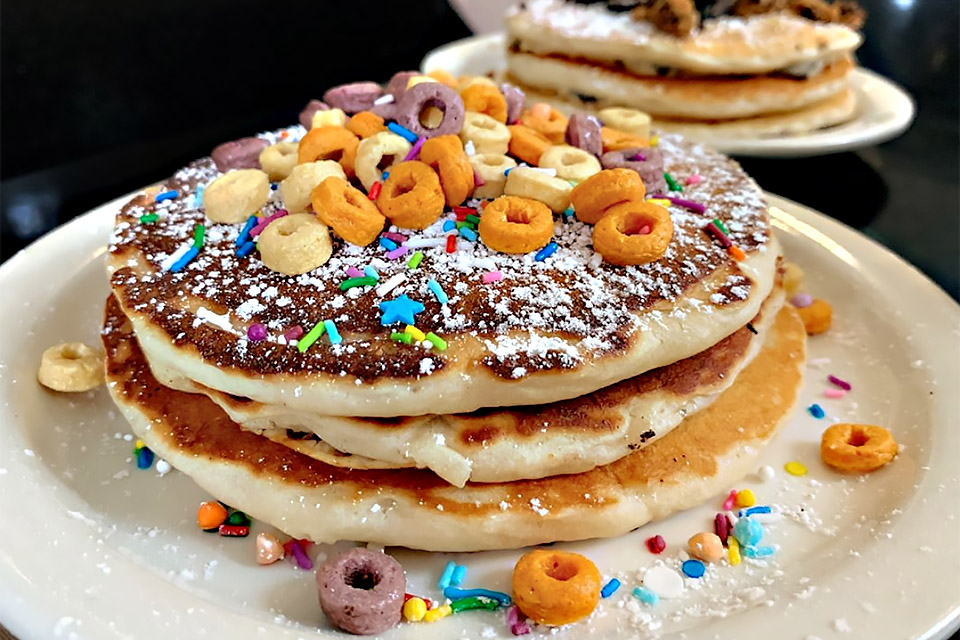 A big ol' stack of pancakes covered in vegan fruit loops and sprinkles is waiting for you at Champs Diner.