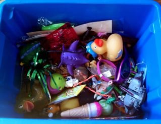 Since I've been doing some Spring cleaning around the house (yeah I'm a little behind) I had a symbiotic dilemma of what to do with all the little plastic goodie bag toys we seem to collect all year long. Bingo.