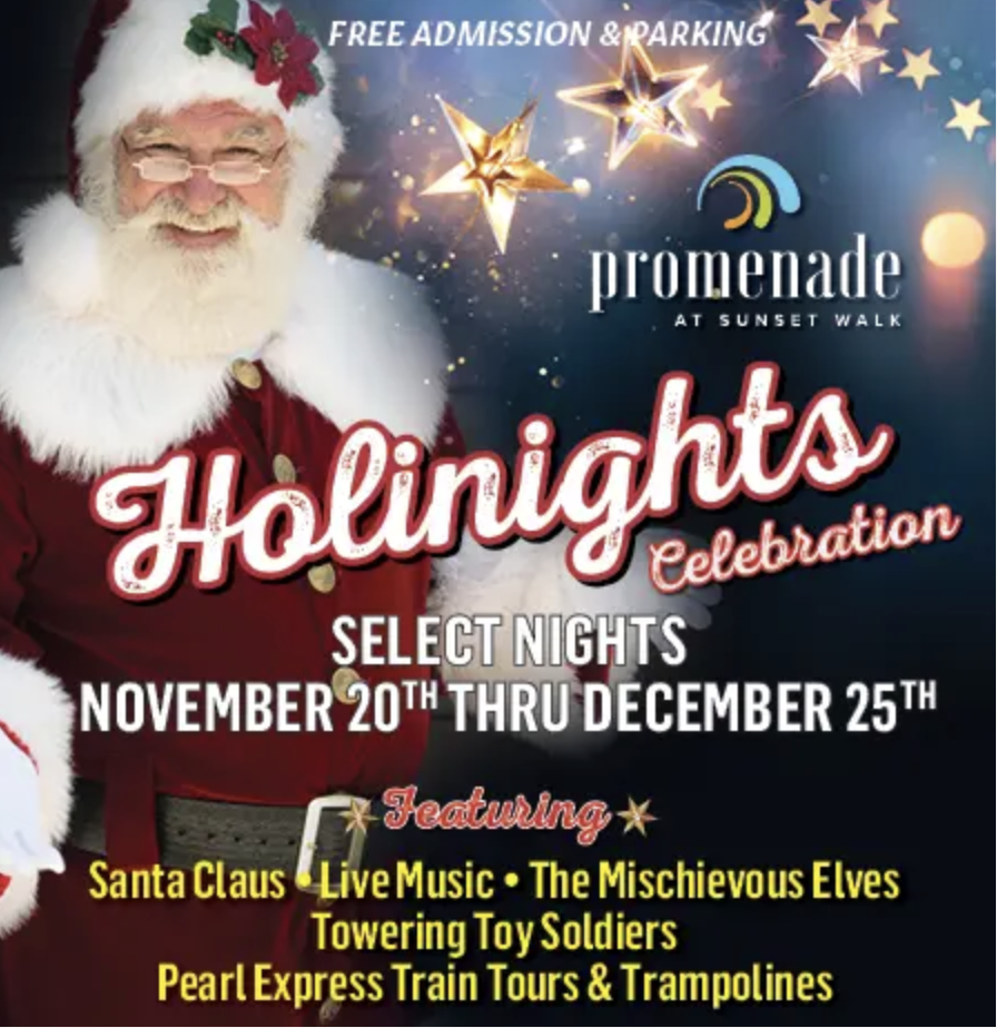 Join the Promenade at Sunset Walk for our annual Holinights Celebration, featuring Santa Claus and his Mischievous Elves, towering toy soldiers, and the nightly lighting of our 40-foot animated Holinights Christmas tree at 6:30 PM.