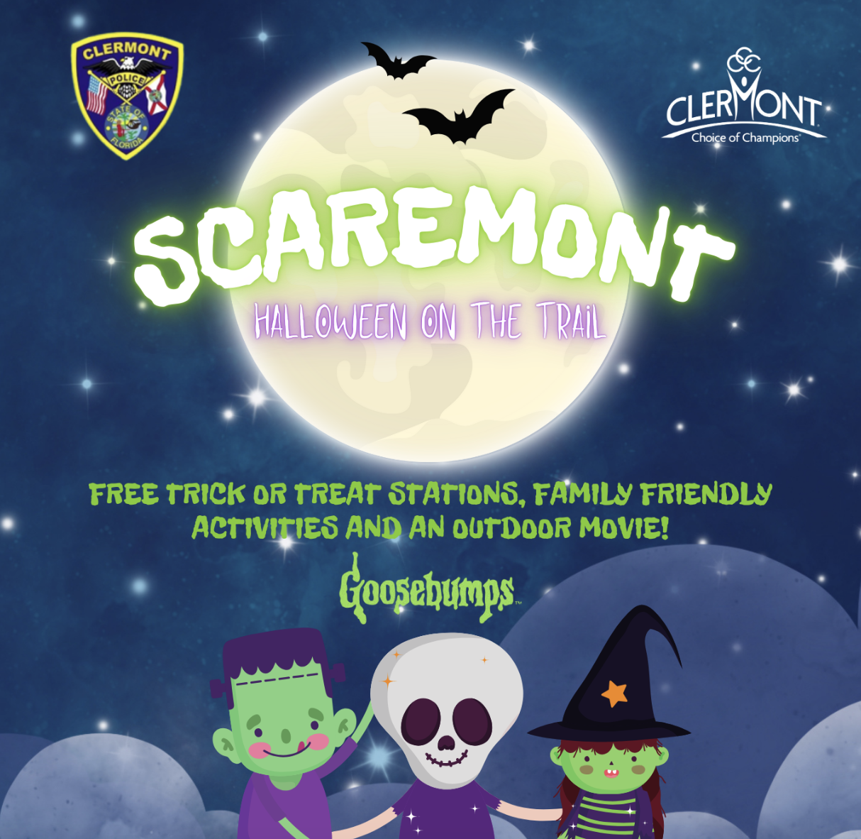 Join Clermont Police Department and the City of Clermont for a "scary" good time at Scaremont - Halloween on the Trail. This free event will have Clermont Police Department along with participating organizations offering trick or treat stations, as well as a Creepy Clermont Costume Contest, Halloween-themed activities, and a showing of the movie Goosebumps starting at 7:15 PM.
