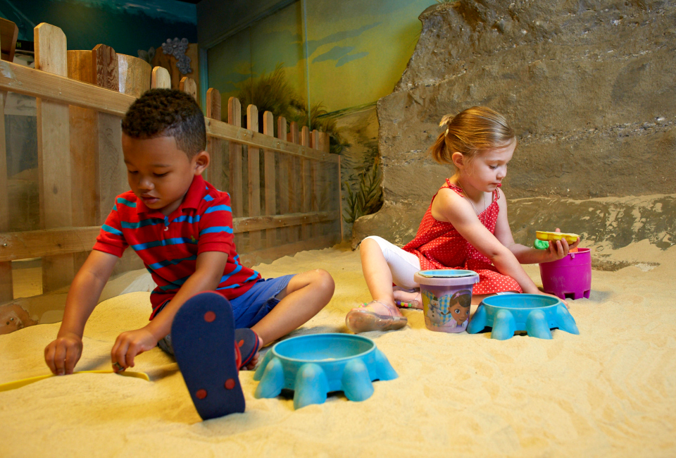 Play in an indoor sandbox at the Outside In exhibit at the Academy of Natural Sciences. Photo by Jeff Fusco/courtesy the museum