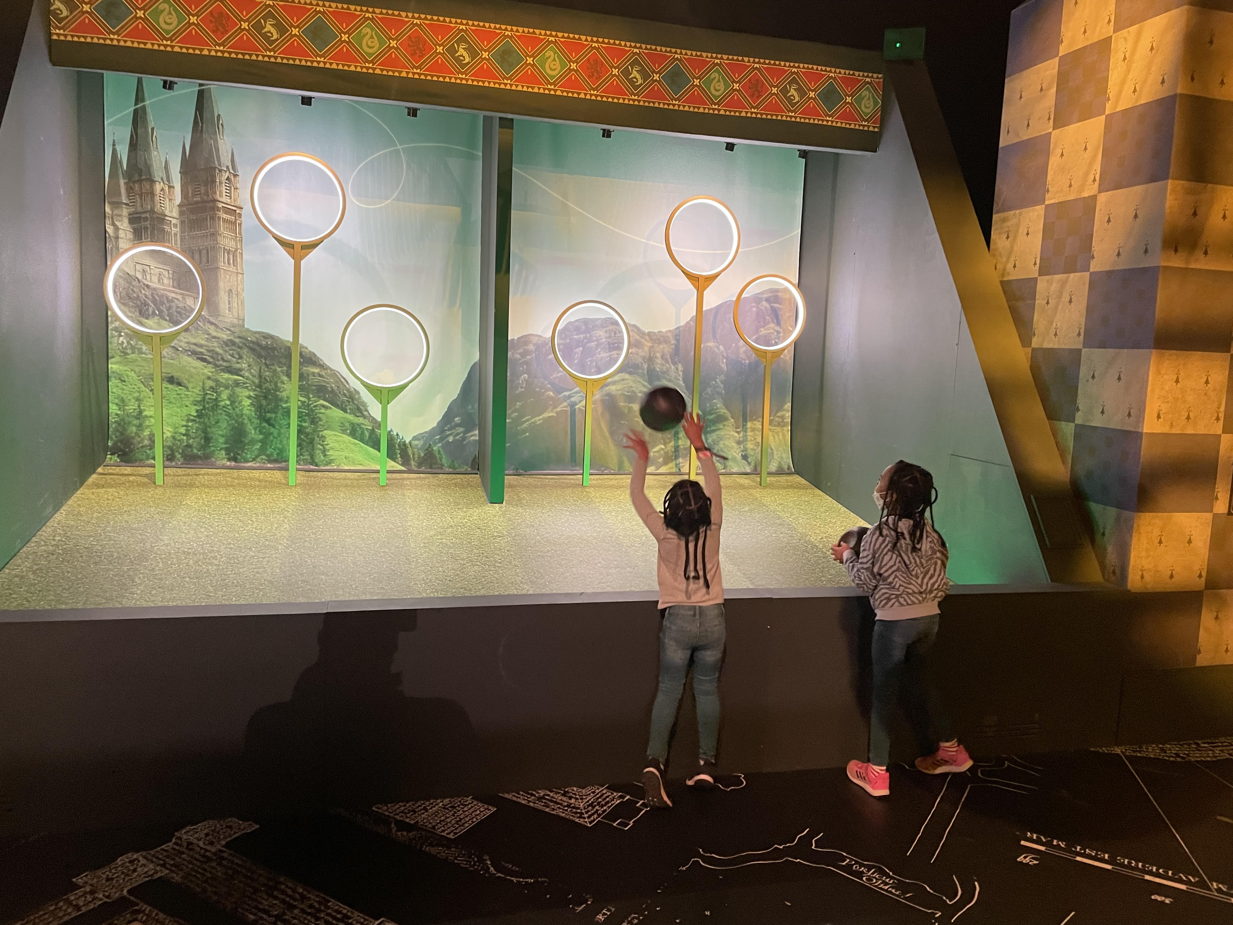 Okay, so you can’t fly on a broomstick, the exhibit isn’t that interactive. But you can make like a chaser and launch a quaffle through a goal in an effort to score points for your team. Next to the game setup, this gallery also features replica broomsticks and Quidditch uniforms from the films.