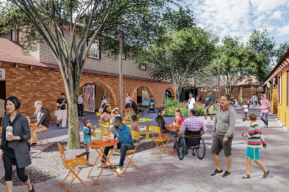 A rendering of the kid-friendly and wheelchair accessible courtyard.