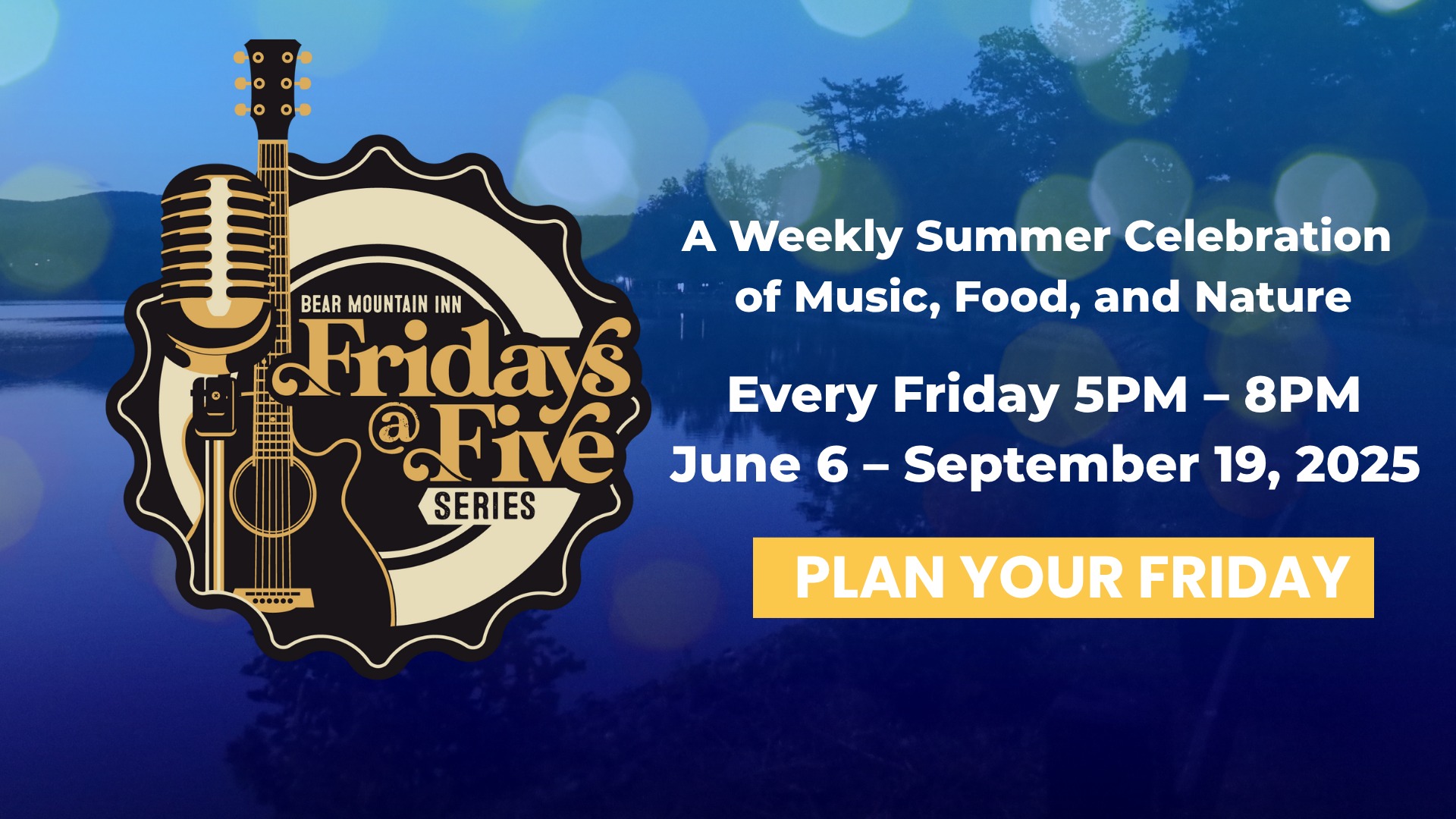 Start your weekend with live music, local food and drinks, and stunning lake views at Bear Mountain Inn’s Fridays @ Five. Bring a blanket or lawn chair, grab a bite and a drink, and relax as the sun sets over the Hudson Valley.