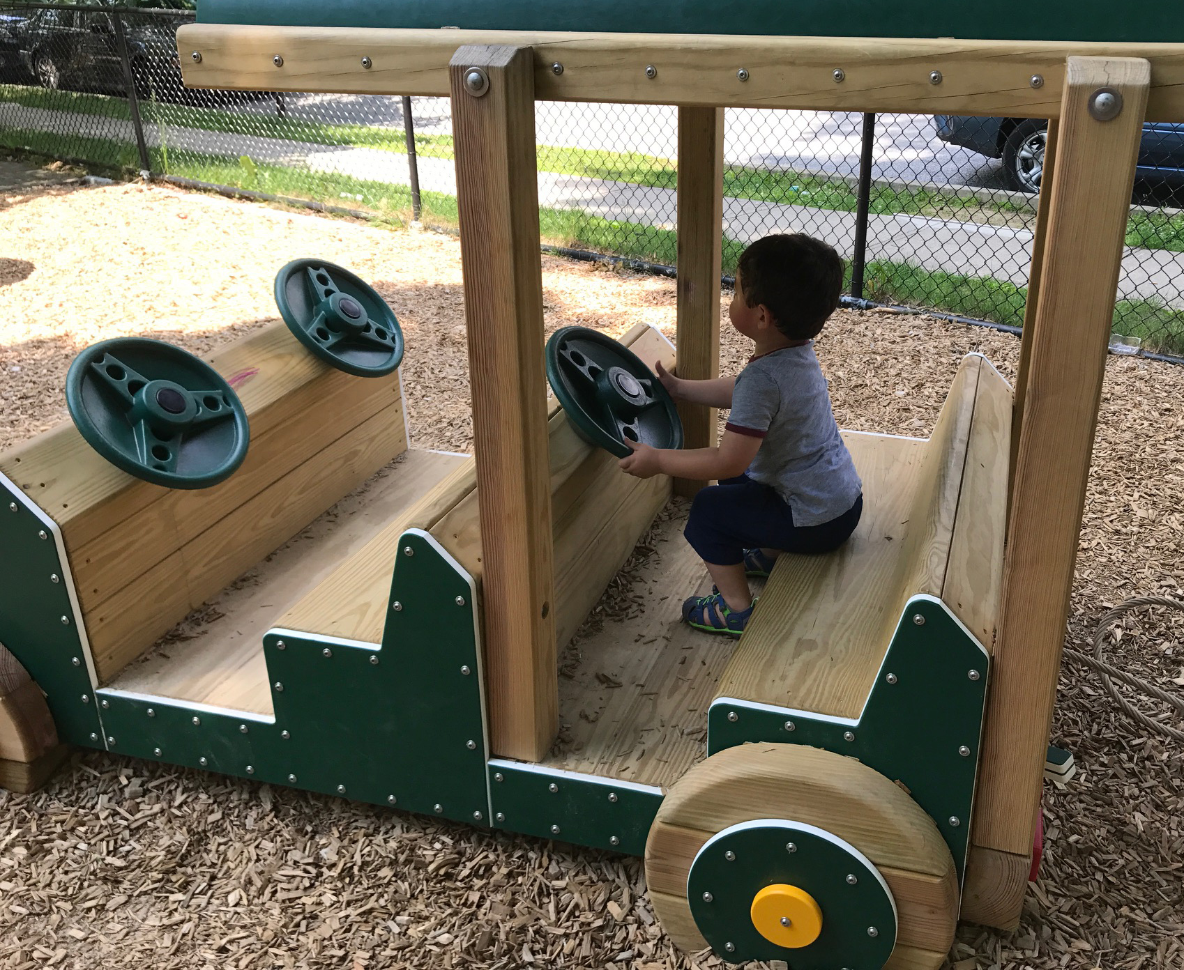 One play area is set up for kids ages 2-5 and offers lots of opportunities for imaginative play. There’s a house-like structure with slides and preschooler-sized climbing ropes, as well as windows and a steering wheel. Next to it is a large wooden car where kids can sit in one of two rows and “practice” their driving. My 2.5-year-old really got a kick out of the small gas station set up in the back and had a blast using the pump to “fill up” the car’s tank.